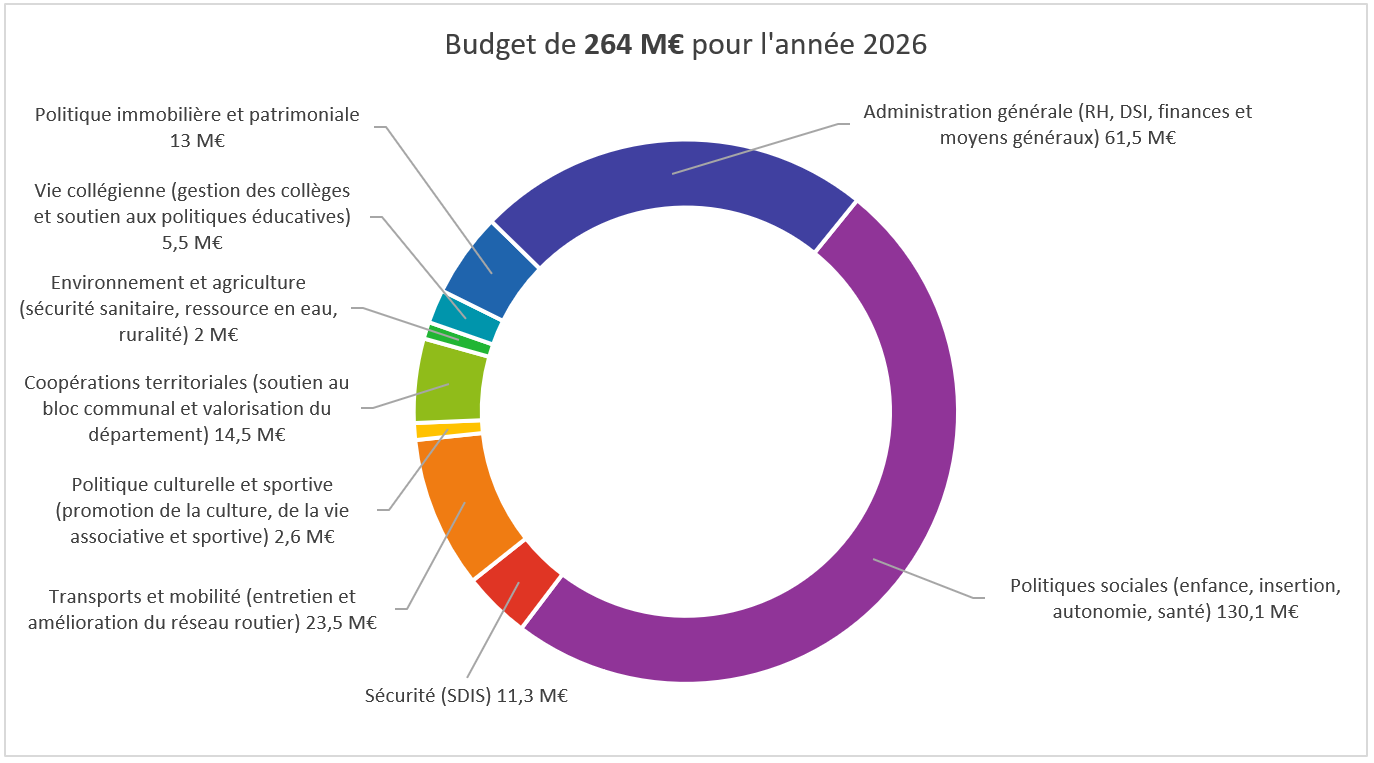 Le budget 2026 de 264 M€ montre une forte priorité donnée au bien-être des habitants, avec plus de 130 M€ consacrés aux politiques sociales, signe d’un engagement important en faveur de la solidarité et de l’accompagnement. Les moyens alloués à l’administration générale, aux transports, à la sécurité et au soutien aux territoires montrent la volonté de renforcer la qualité des services publics et d’améliorer le cadre de vie, à travers des dépenses de fonctionnement comme d’investissement.