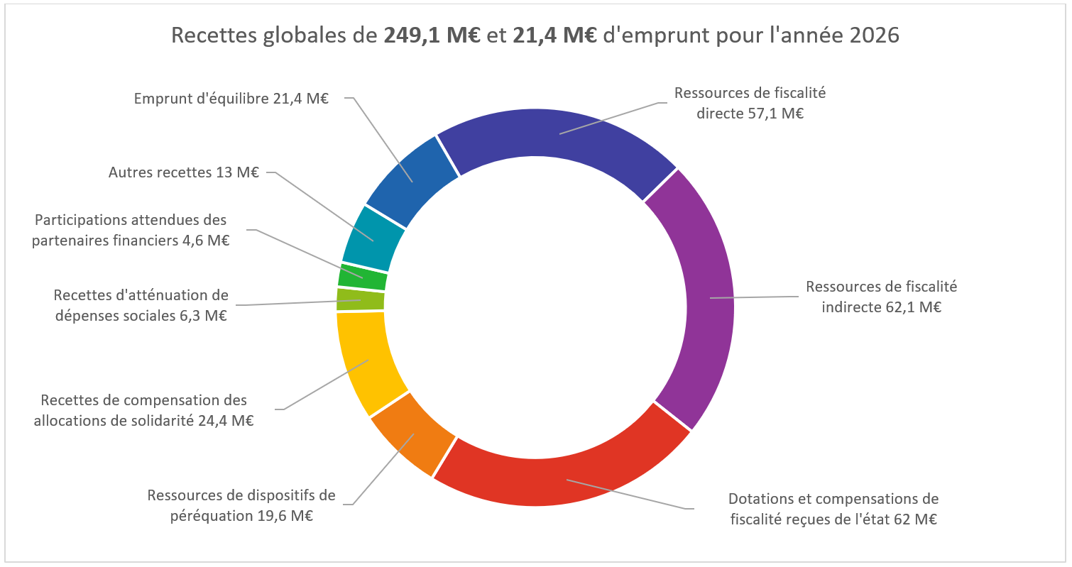 Les recettes globales pour 2026 atteignent 249,1 M€, soutenues principalement par la fiscalité directe et indirecte ainsi que par les dotations de l’État, ce qui offre une base financière solide pour mener les actions du département. L’emprunt d’équilibre de 21,4 M€ et les autres contributions financières viennent compléter ces ressources, permettant de garantir la continuité et le développement des services publics au bénéfice de tous. Les dépenses de fonctionnement s’établissent à 217,5 M€, pour des recettes de fonctionnement de 237,9 M€, permettant de dégager un autofinancement de 20,5 M€.
