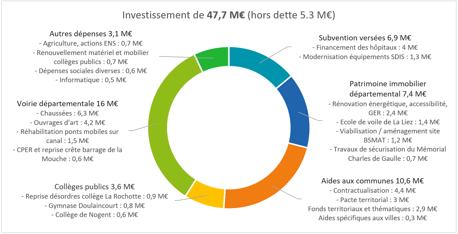 Les élus du Département ont fait le choix d’investir plus de 47 M€ en 2026. Ces investissements sont financés par 11,2 M€ de recettes d’investissement, 20,5 M€ d’autofinancement et un emprunt d’équilibre de 21,3 M€.