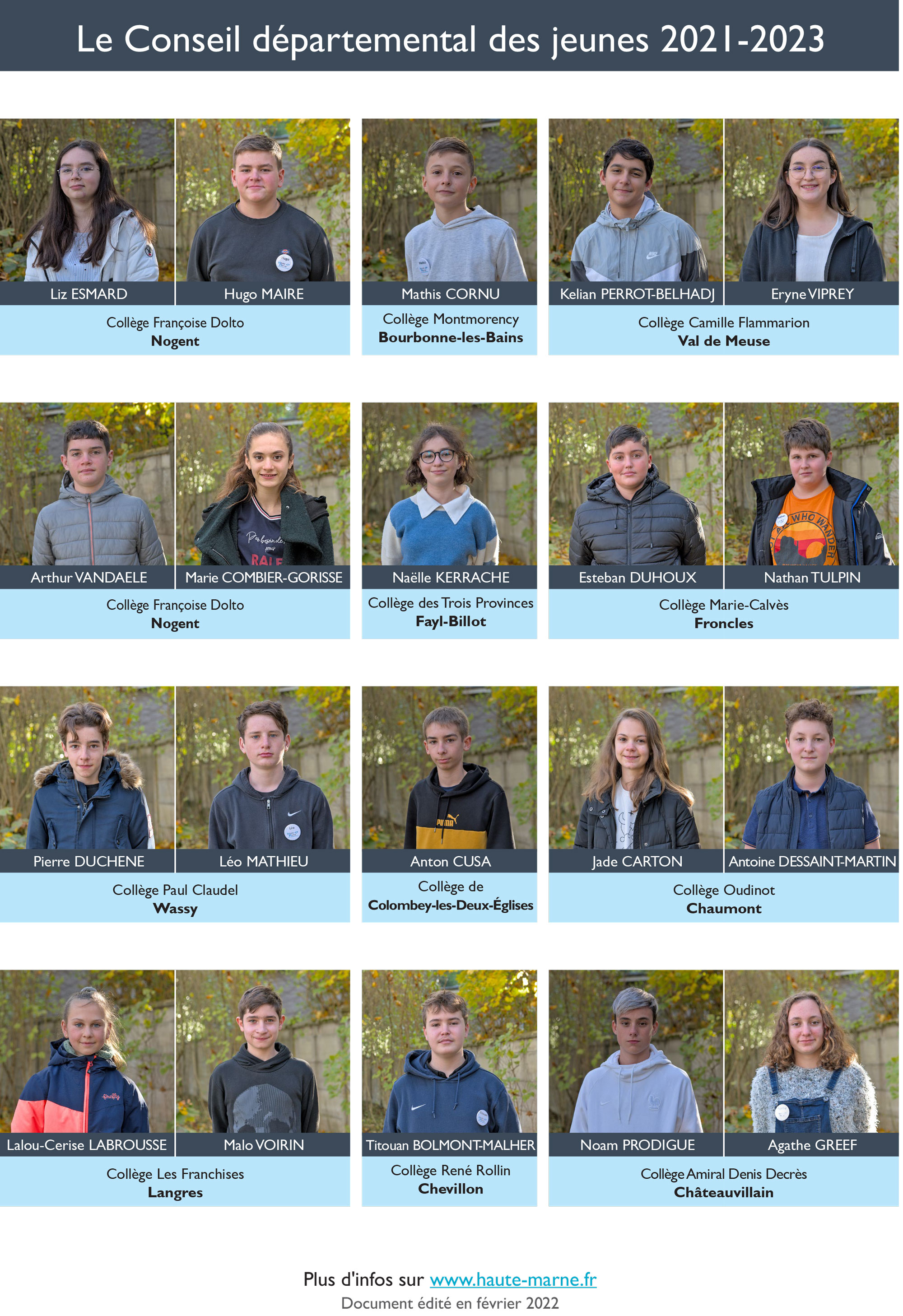 Le Conseil départemental des jeunes offre aux collégiens de 5e la possibilité de s’exprimer sur des sujets qui les préoccupent et de s’investir dans l’élaboration de projets et la mise en place d’actions d’intérêt général pour les jeunes haut-marnais. C’est également un moyen privilégié de découvrir le rôle de l’institution départementale.