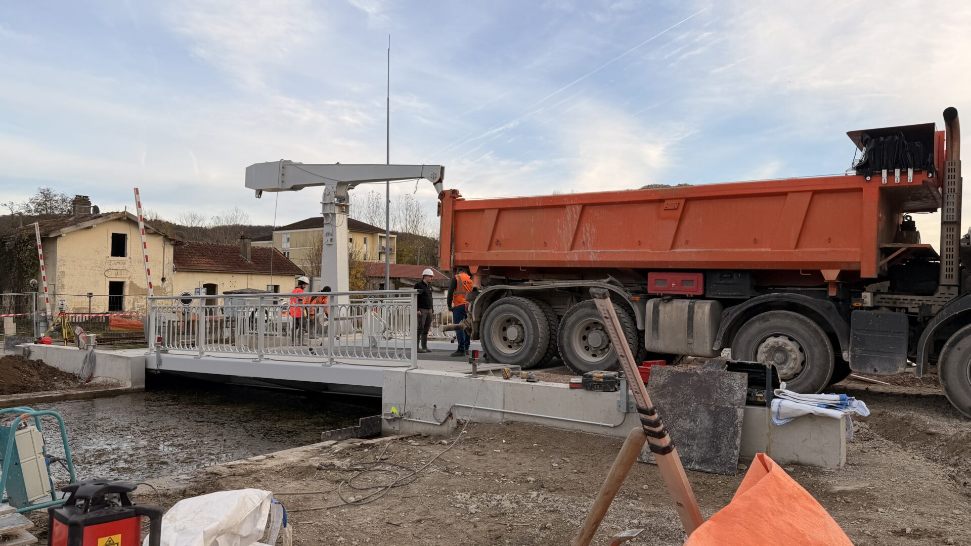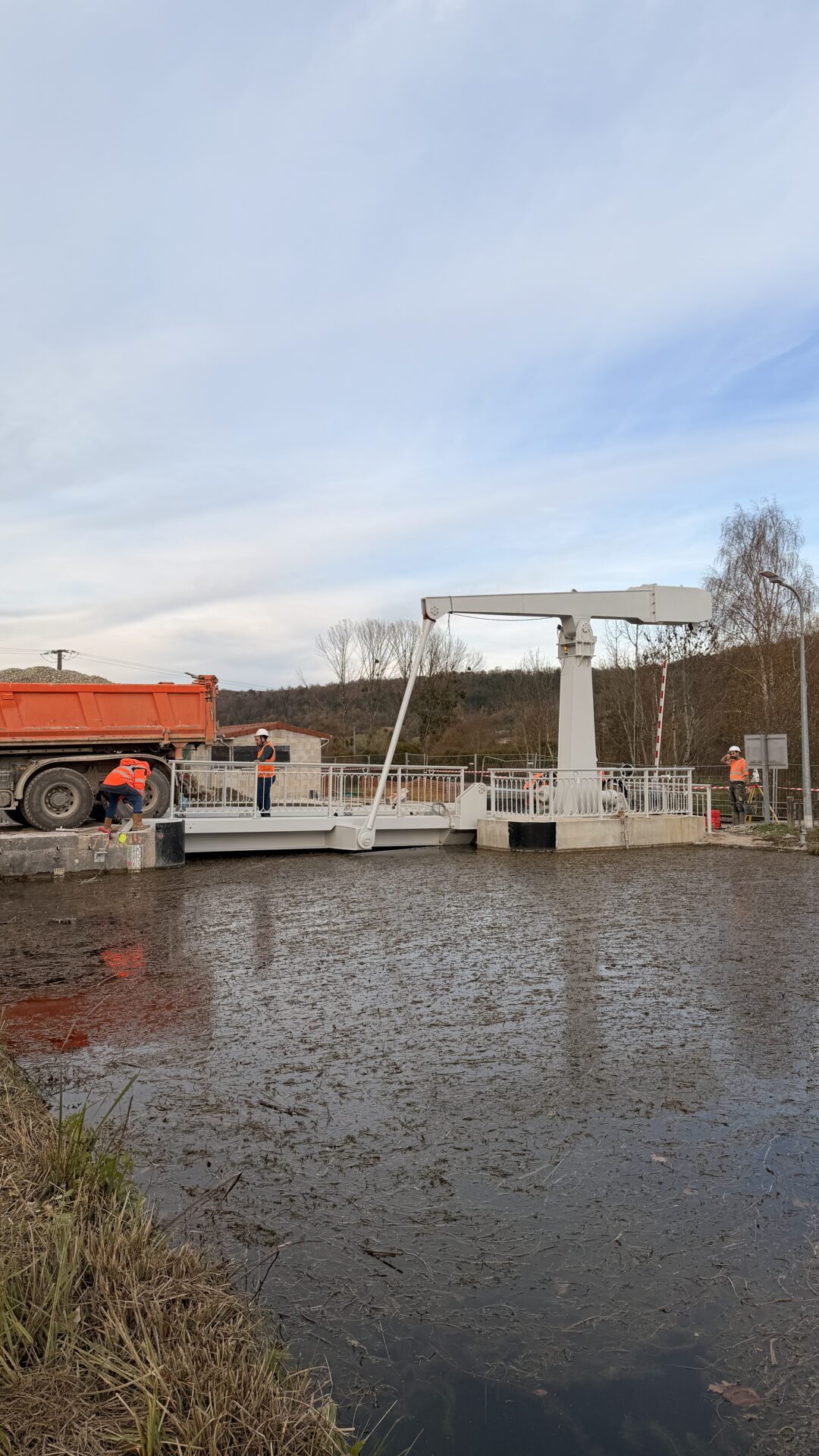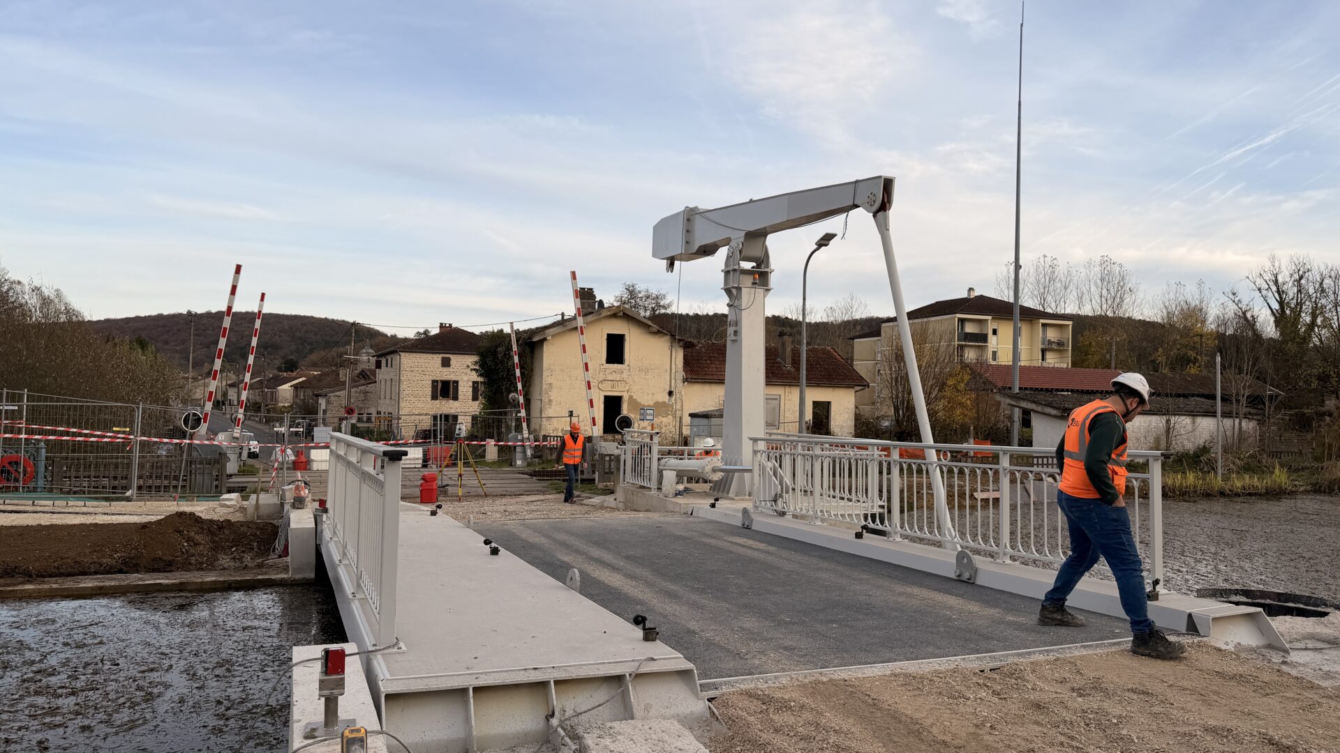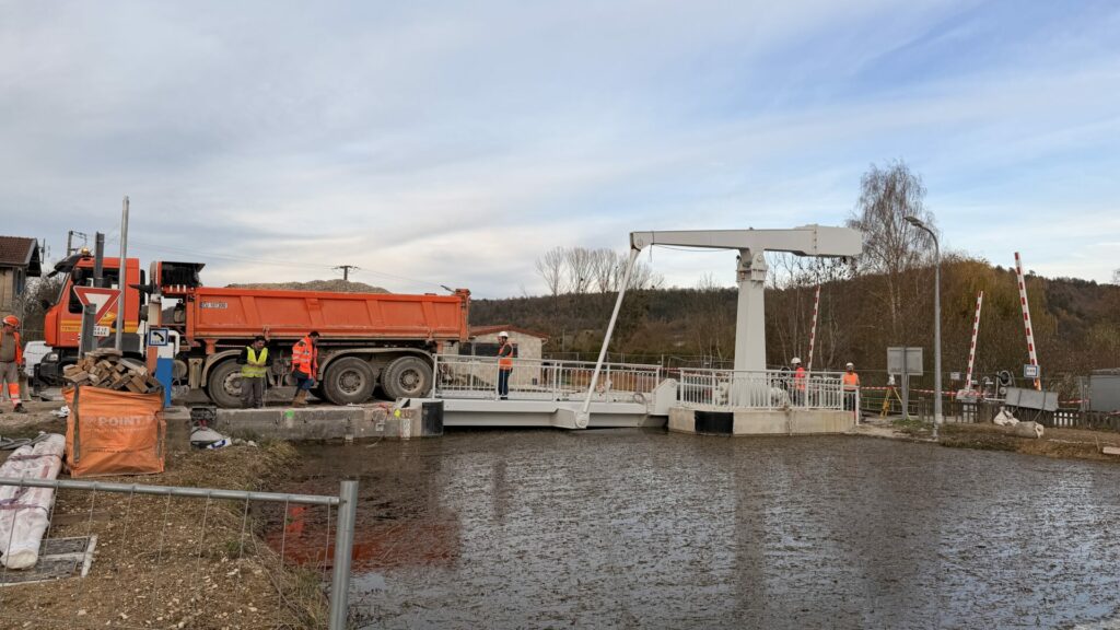 La maîtrise d’œuvre est assurée par le Département, assisté des services techniques de maintenance de Voies Navigables de France. Le projet est actuellement en phase de finalisation, comprenant notamment une épreuve de chargement avec le passage d’un poids lourd, la réalisation des aménagements de la chaussée et des abords, la finition du local technique, et la vérification des installations électriques pour la coordination des signaux. Cette réalisation, dont le coût s’élève à 1 250 000 €, financée par le Conseil départemental, VNF et le GIP, contribuera à une meilleure mobilité sur le territoire.