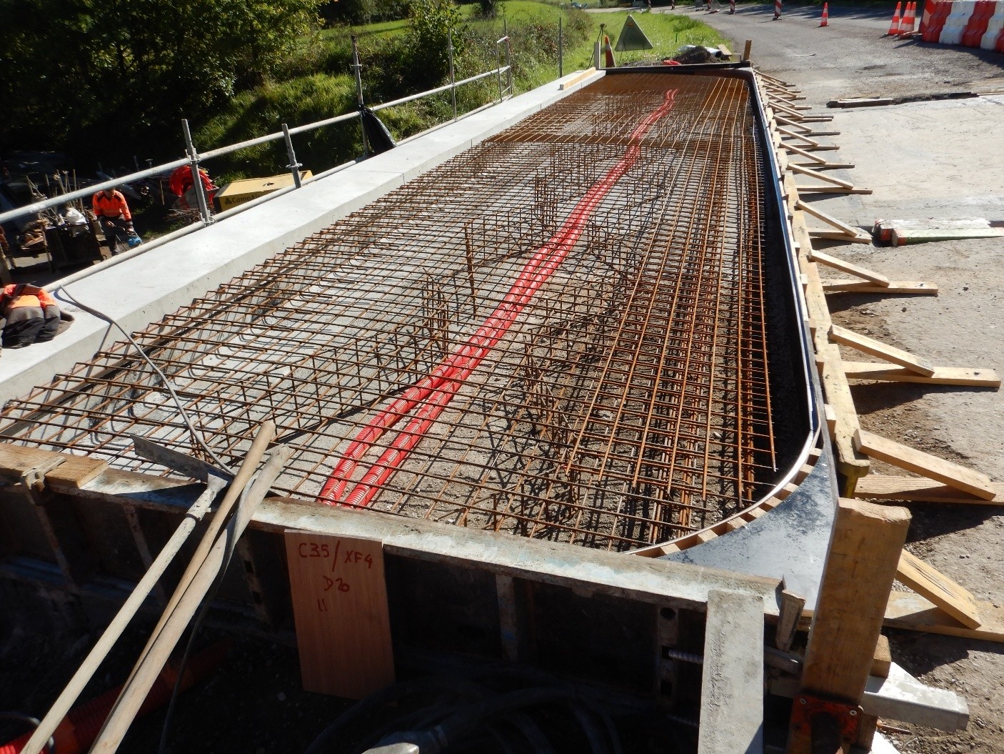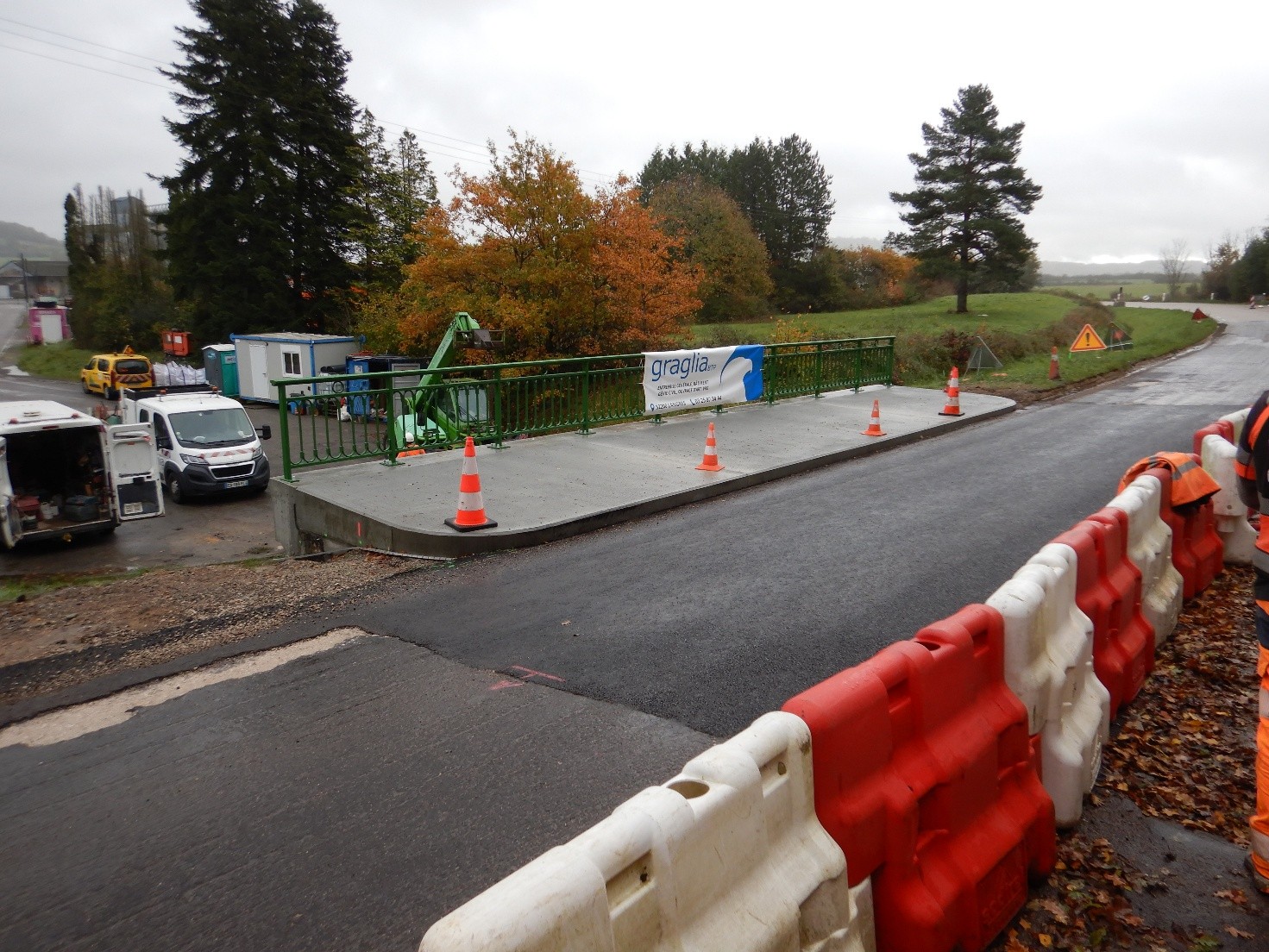 Les travaux, engagés le 18 août 2025, ont consisté en la réfection totale de la partie supérieure du pont. Après rabotage de la chaussée et démolition des anciens garde-corps et trottoirs, l’étanchéité défectueuse a été retirée. Deux nouvelles corniches ont été réalisées sur place avant la mise en œuvre d’une nouvelle étanchéité. Les trottoirs ont ensuite été reconstruits en béton et de nouveaux garde-corps 2 ont été installés. La réfection s’est achevée par la pose d’un nouvel enrobé sur la chaussée.