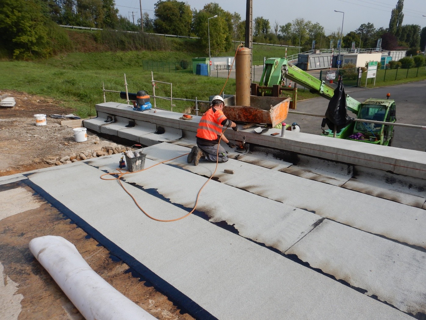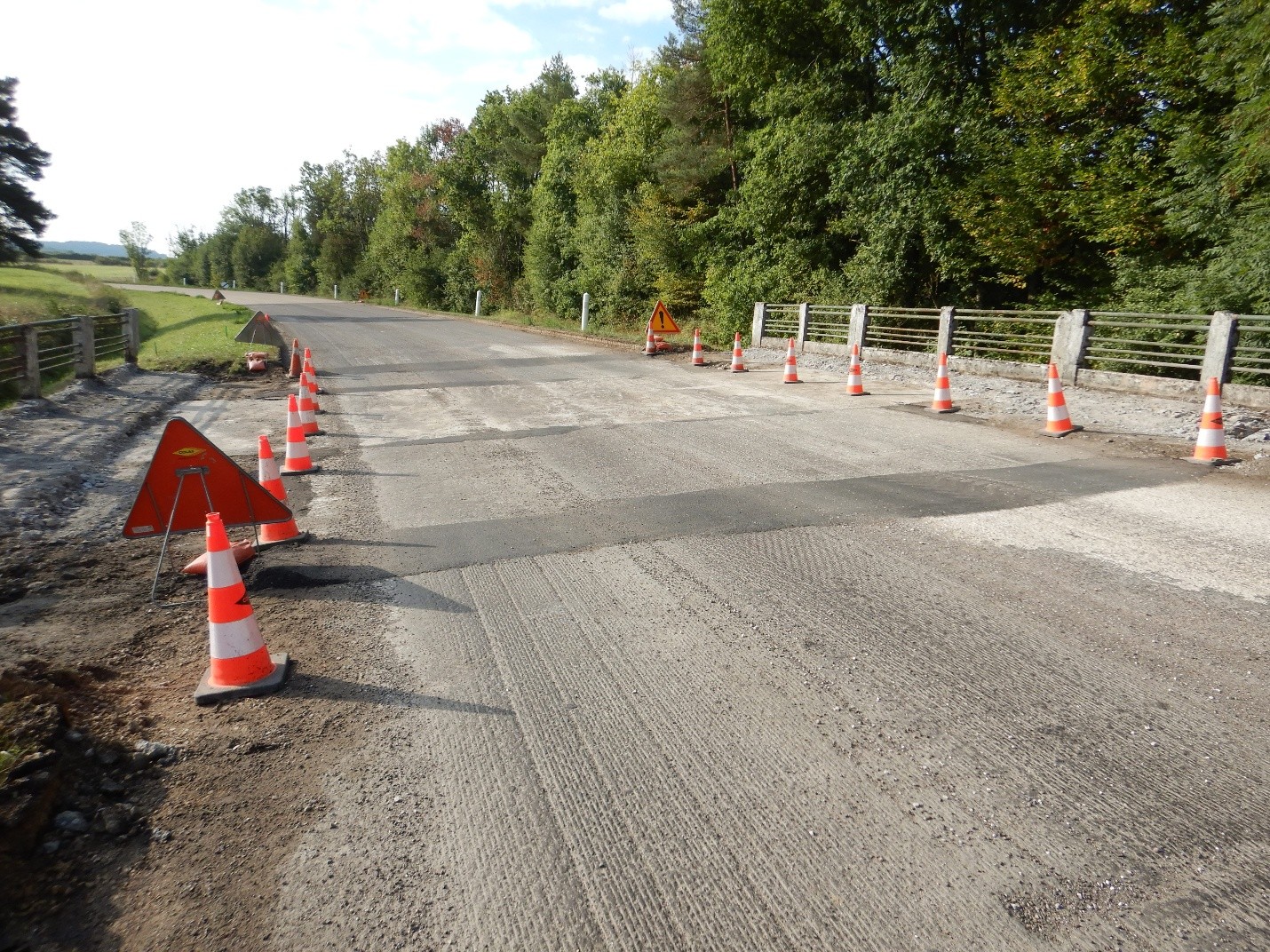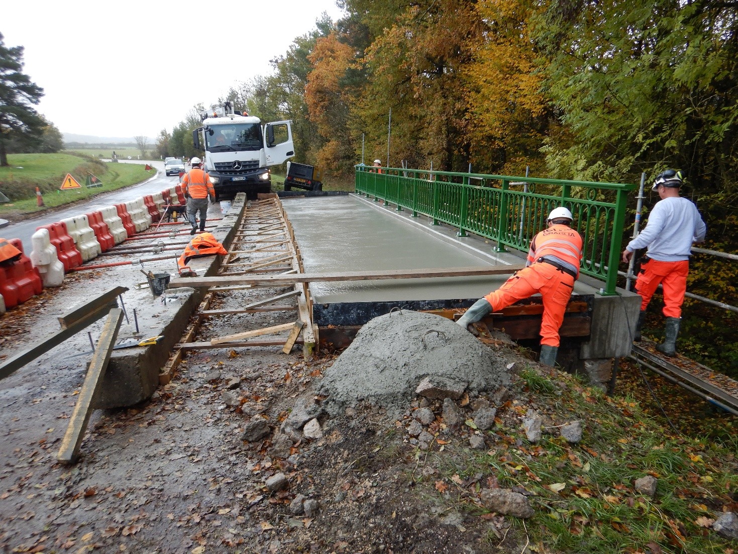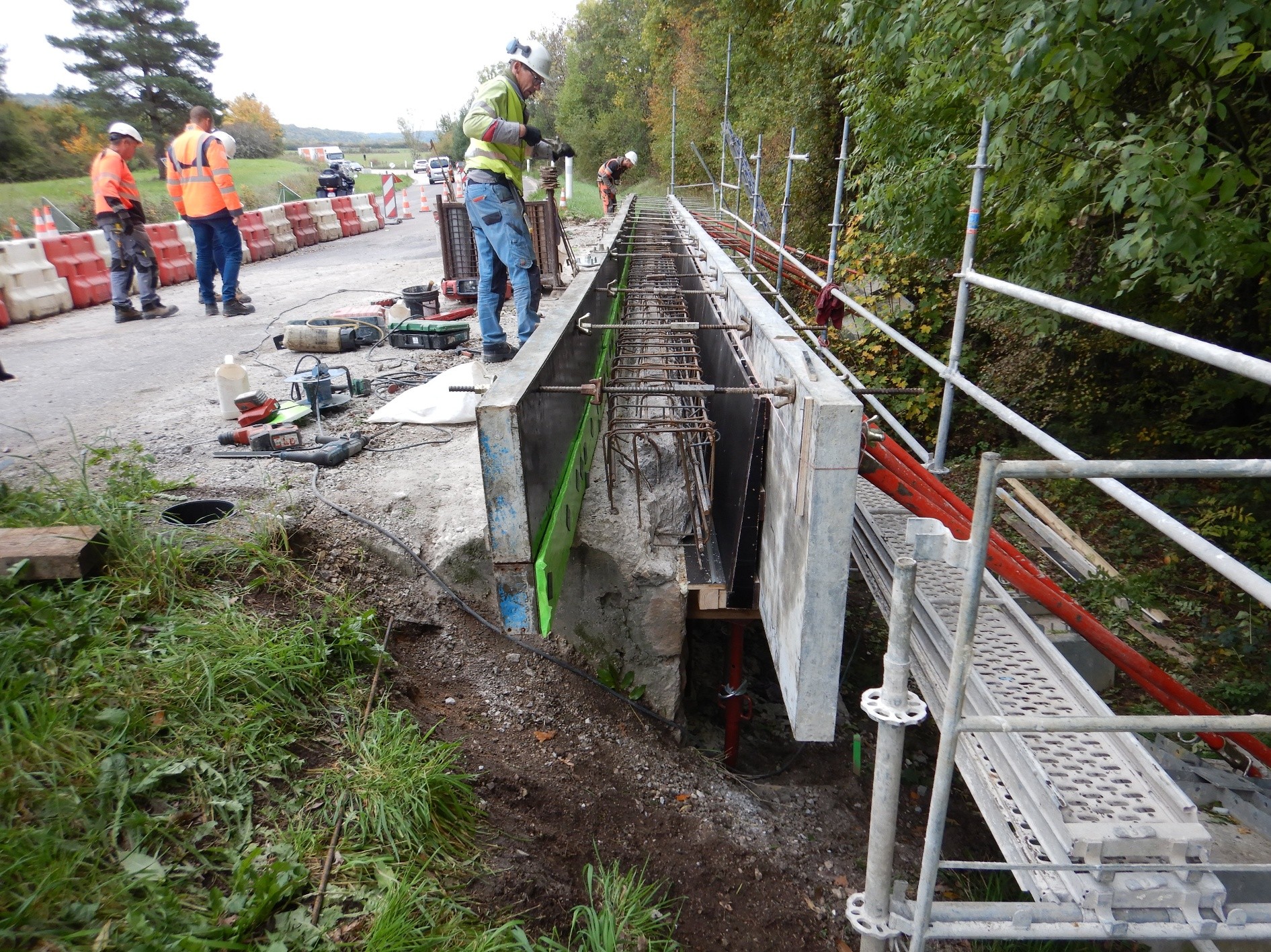 Les travaux, engagés le 18 août 2025, ont consisté en la réfection totale de la partie supérieure du pont. Après rabotage de la chaussée et démolition des anciens garde-corps et trottoirs, l’étanchéité défectueuse a été retirée. Deux nouvelles corniches ont été réalisées sur place avant la mise en œuvre d’une nouvelle étanchéité. Les trottoirs ont ensuite été reconstruits en béton et de nouveaux garde-corps 2 ont été installés. La réfection s’est achevée par la pose d’un nouvel enrobé sur la chaussée.