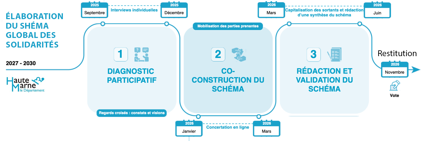 Entre octobre 2025 et juin 2026, le Conseil départemental lance une démarche collective pour imaginer le Schéma Global des Solidarités 2027-2030, un projet qui rassemble tous les acteurs du territoire autour d’un même objectif : mieux répondre aux besoins de chacun, à chaque étape de la vie.